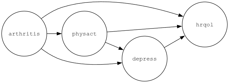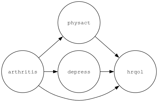 Suppose we wish to find out whether arthritis in humans affects their health-related quality of life. To the extent that it does, we also wish to disentangle the causal pathways through which this effect operates. In particular, we are interested in determining whether physical activity and depression mediate this effect. Does arthritis decrease physical activity, which in turn decreases quality of life? Does arthritis increase severity of depression, which in turn decreases quality of life?