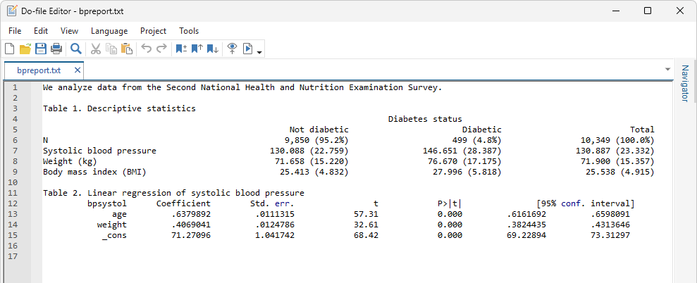 Unlike EPUB and HTML files, plain text files cannot contain embedded images. Therefore, we use the putdocx suite of commands to create a file with a table of descriptive statistics and a table of regression results. We use data from the Second National Health and Nutrition Examination Survey (NHANES II) (McDowell et al. 1981) to analyze blood pressure, weight, and body mass index. We run the following commands to create our .docx file: