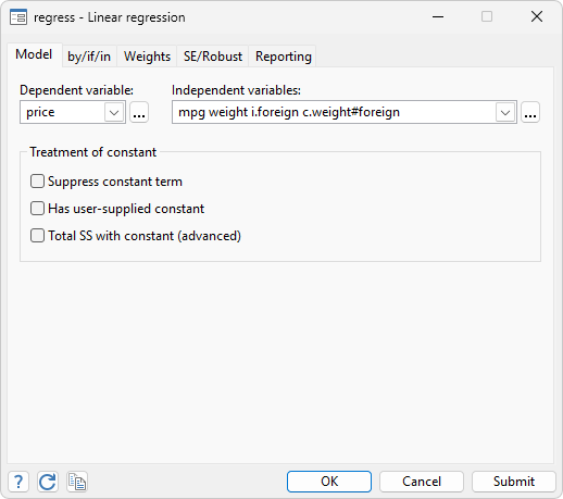 . sysuse auto . regress price mpg weight i.foreign c.weight#foreign