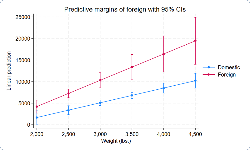 . margins foreign, at(weight=(2000(500)4500)) plot