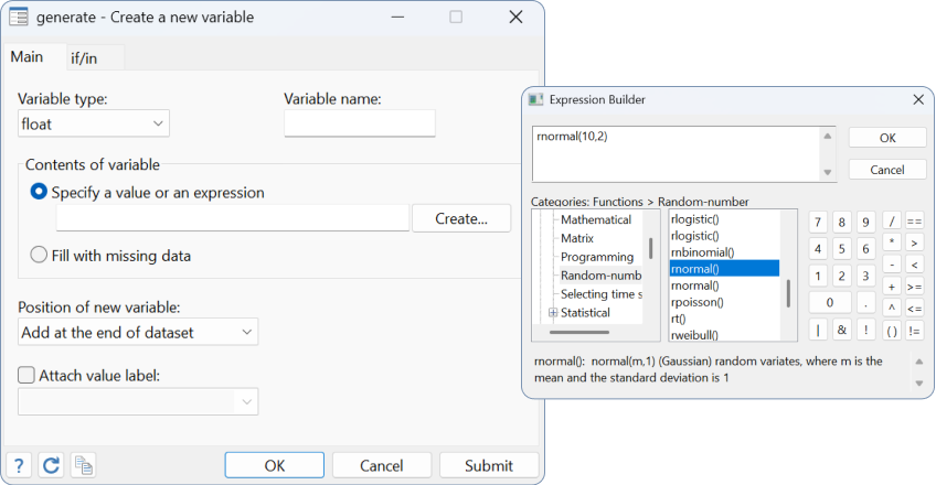 . clear . set obs 100 Number of observations (_N) was 0, now 100. . generate normal = rnormal(10,2) . generate binomial = rbinomial(20,.4)