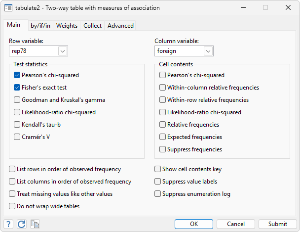 . sysuse auto . tabulate rep78 foreign, chi2 exact Enumerating sample-space combinations: stage 5: enumerations = 1 stage 4: enumerations = 3 stage 3: enumerations = 24 stage 2: enumerations = 203 stage 1: enumerations = 0