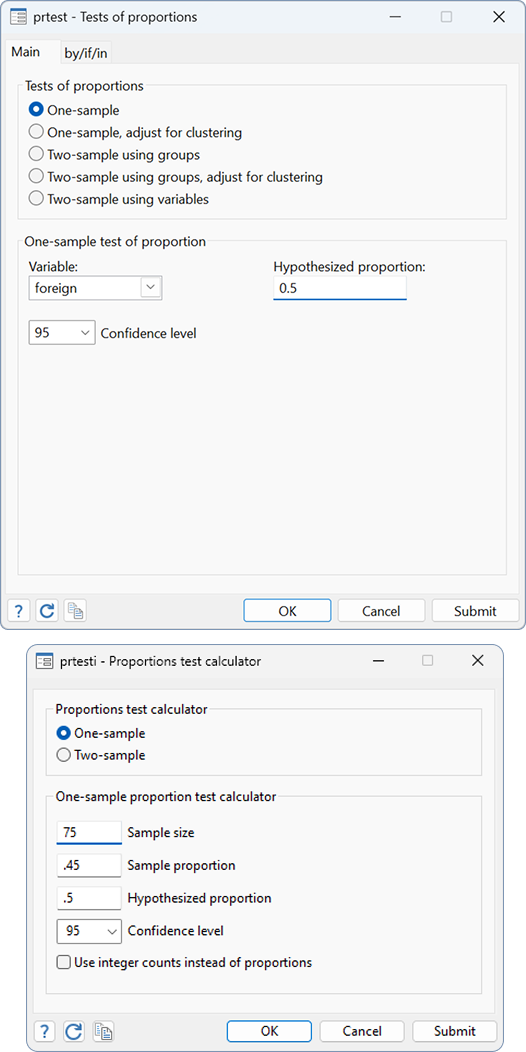 To learn more, see [R] prtest and [U] 19 Immediate commands →