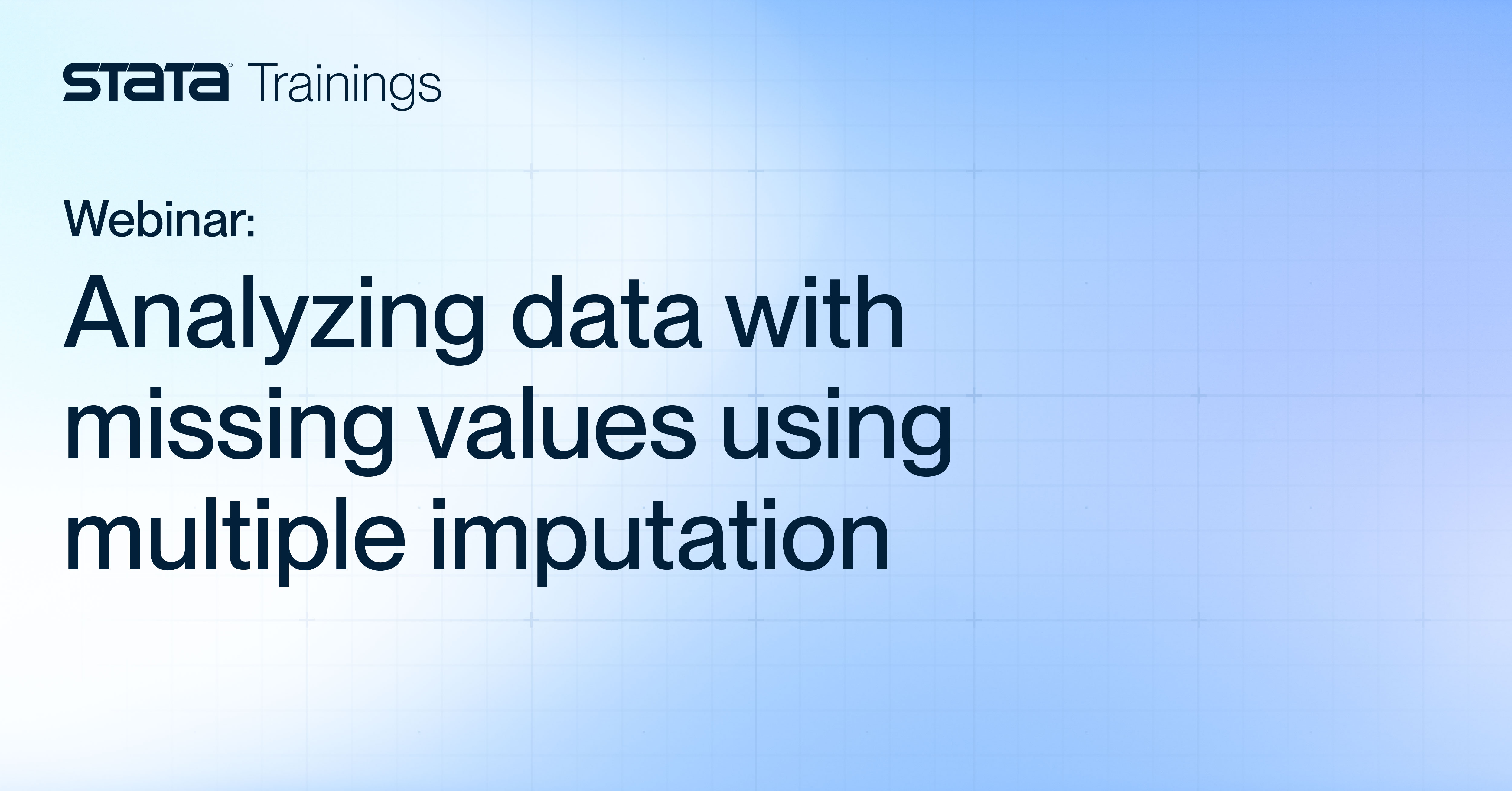 This webinar introduces concepts fundamental to missing data and multiple imputation. We will demonstrate how to perform multiple imputation in Stata using the mi suite of commands, from data set up and choosing an appropriate multiple imputation model to performing analyses that properly account for missing-data uncertainty.